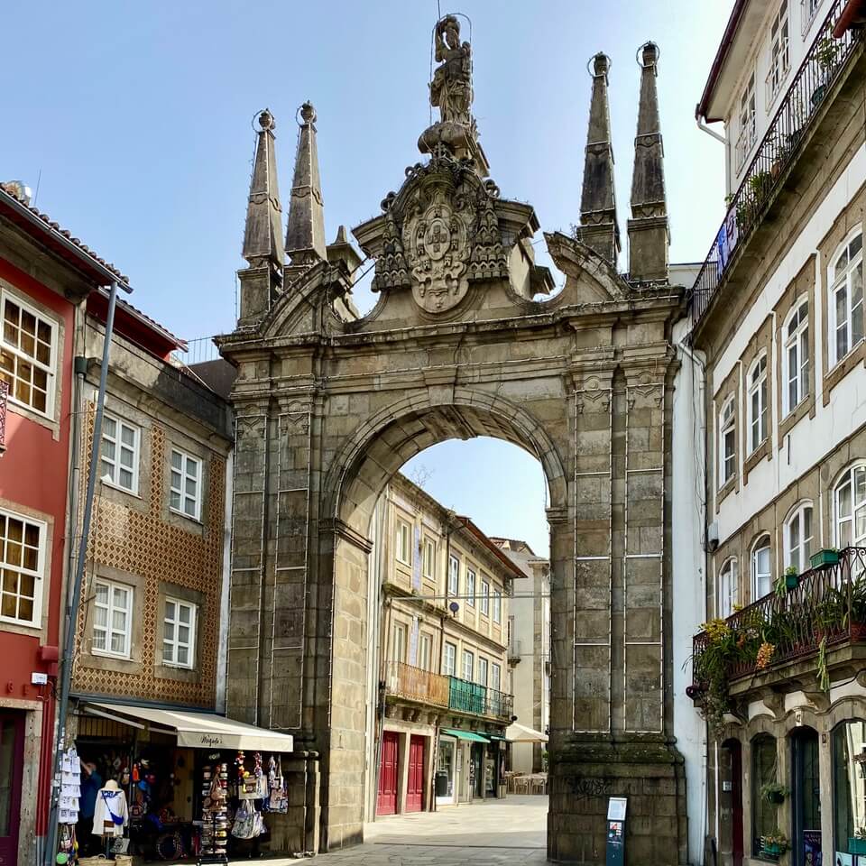 In der Altstadt von Braga schreiten wir durch den barocken Torbogen – Arco da Porta Nova. Dieses Tor wurde niemals verschlossen bzw. hatte gar keine Tür, wie es sonst in mittelalterlichen Städten üblich war.
