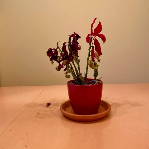 Dasselbe kann man vom Weihnachtsstern sagen. Mein Ziel war es, ihn über die Feiertage zu bringen, aber vor ein paar Tagen ist er in Art Schockzustand verfallen, wovon er sich nicht mehr erholt hat. Ich habe ihn 1x pro Woche mäßig gegossen, er ist nicht in direkter Sonneneinstrahlung gestanden und auch nicht neben der Heizung … und sorry, Weihnachtsstern, wenn es in meinem Wohnzimmer mehr als 17 Grad hat.