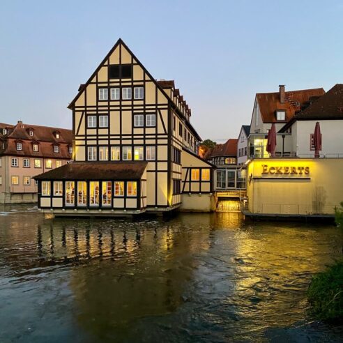 Im Restaurant Brüderla schickt man uns weg; keine Chance ohne Reservierung. Die Kellnerin gibt uns jedoch einen Tipp: Landgasthof Eckerts. Das Lokal ist gut sichtbar in der Mitte der Regnitz gelegen; den Weg dorthin zu finden ist allerdings gar nicht so einfach, wenn man nicht eine nächtliche Schwimmpartie einlegen möchte.