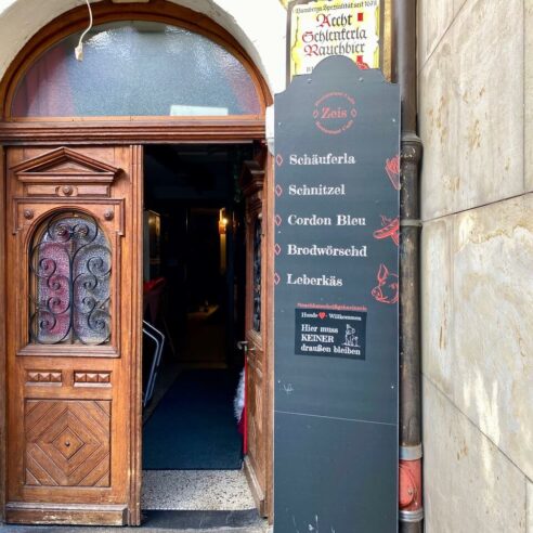 Das Abendessen lässt sich mühsam an. Das berühmte Bierlokal Schlenkerla – alle Worte enden hier mit „la“ – weigert sich, mir eine Kostprobe ihres Rauchbiers zu geben und ich will keinen halben Liter eines Bieres kaufen, das ich wahrscheinlich gar nicht mag. Ich habe gehört, dass es wie flüssiges Geselchtes schmecken soll … also bin ich lieber vorsichtig. Auch kleinere Mengen, wie Seidl oder Pfiff, gibt es hier nicht zu kaufen. All in oder all out. Ich entscheide mich für out.